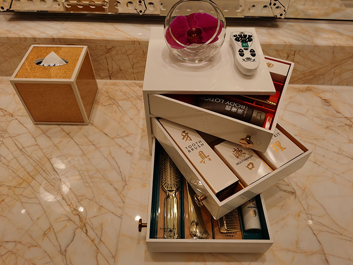 澳門永利皇宮酒店客房一次性用品標識的個性化設計,以旋轉的方式來呈現。